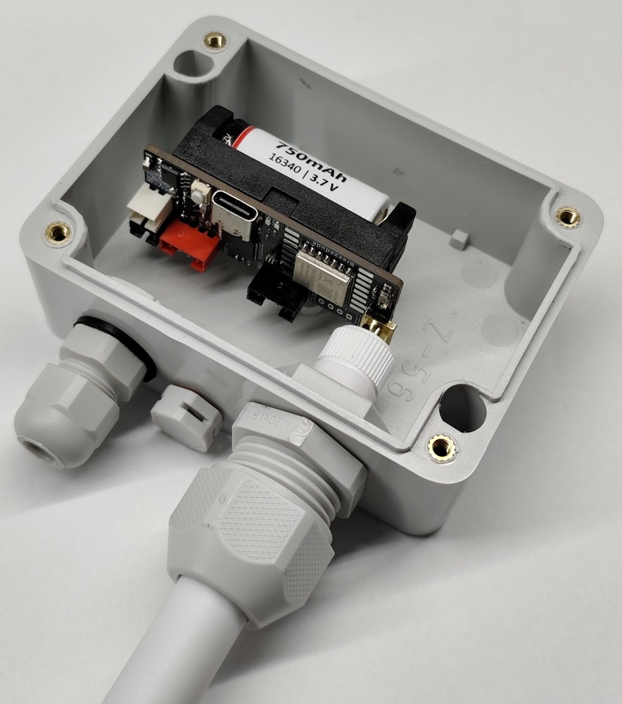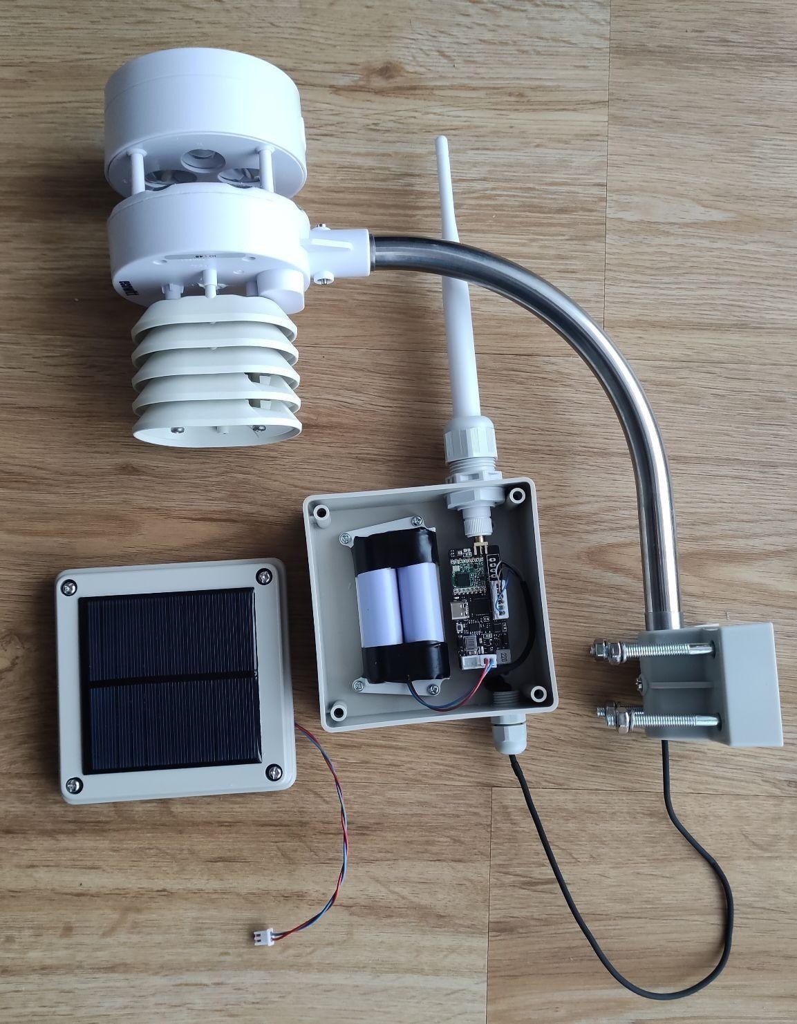 Die Hardware wurde für UART Sensoren (Ecowitt WS80 und WS85) sowie für den analogen Sensor DAVIS 6410 optimiert. Der auf der Rückseite verbaute 750mAh Akku reicht für 14 Tage ohne Sonne, für besonders schattige Plätze kann weiterhin eine 18650 Zelle verwendet werden, die für 50 Tage Akkulaufzeit ohne Solarstrom reicht. Alle Eingänge sind gegen statische Überspannung geschützt und eine zweite, rote LED zeigt Fehler besser erkennbar an.